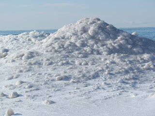 Notice how some of the shore ice comprises frozen ice balls that accreted together at the end of the storm. These ice chunks were broken off the shore ice by the waves, only to reassemble.