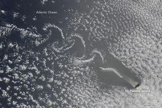 Mountain peaks slice through the clouds above St. Helena Island, creating Von Karman vortices. The island is located in the South Atlantic. Such spiral cloud formations occur commonly in nature, They are called Von Kaman vortexes.